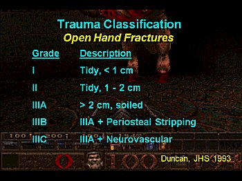 A useful prognostic classification system for open tibial fractures was developed by Gustilo. This system was modified to apply to open phalangeal fractures by Duncan. Grading is based on wound size, periosteal stripping (either traumatic or surgical) and neurovascular injuries. |