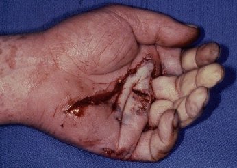 Vascular branch points also complicate graft reconstruction. This injury was associated with disruption of the ulnar artery and branches of the palmar arch which required individual vascular reconstruction. (Case of Dr. Graham Lister)