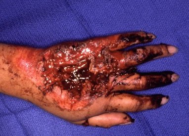 Hand out the window in a rollover car accident, with a crush / abrasion through the dorsal hand and segmental loss of skin, tendons and bone. A curet is a bad tool for debridement of this type of wound - it scrapes away soft debris, leaving avascular contaminated fibrous tissue at the wound margin. |