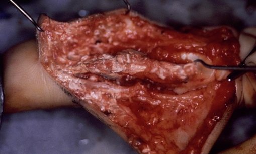 This finger sustained a high pressure injection injury, white paint tracking down fascial planes. This requires meticulous dissection to remove debris without causing further damage to nerves, vessels and tendons.